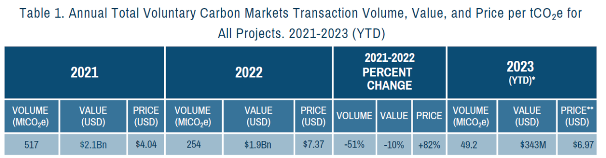 Yet a pair of new market research reports from our Ecosystem Marketplace team offer evidence for optimism that an emphasis on integrity in carbon markets is delivering results. The latest State of the Voluntary Carbon Markets 2023 report finds the market consolidating around a smaller but committed set of buyers willing to pay premium prices for higher quality credits. A second study provides compelling evidence that companies that participate in voluntary carbon markets are leading across a range of measures of robust climate action, accountability, and ambition—outperforming companies that do not buy carbon credits.
