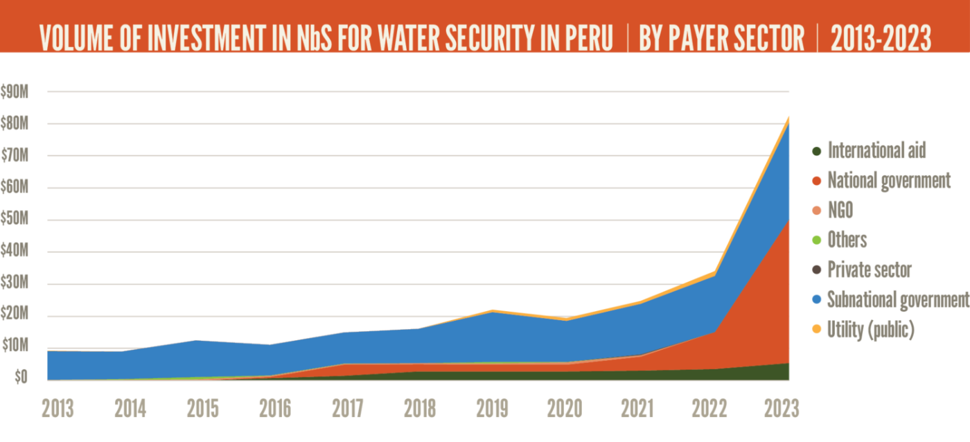 The results speak for themselves. Between 2016 and 2023, investment in nature for water security in Peru grew more than sevenfold, reaching $80 million in 2023 alone (Figure 1)—the highest of any Latin American country. More importantly, institutions responsible for drinking water, disaster risk management, and rural development now look upstream for solutions, treating forests and wetlands as core water infrastructure.